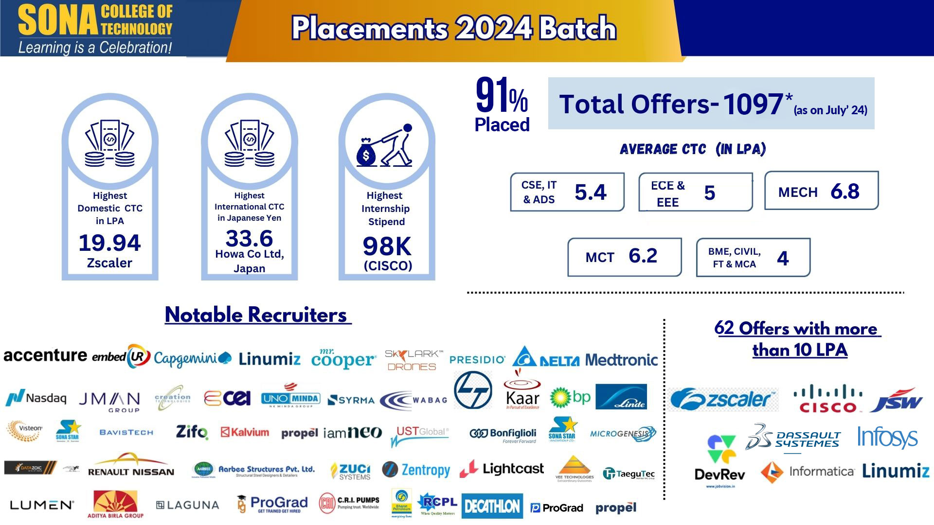 At Sona, Placement time is not a mere annual ritual; it is a time for showcasing the very best in our young engineers to the industrial world. The Placement & Training Cell functions with the primary aim of placing students in top-notch companies even before they have completed their courses. The Placement & Training cell goes all out to train the students to meet the high industry expectations.